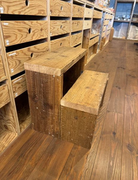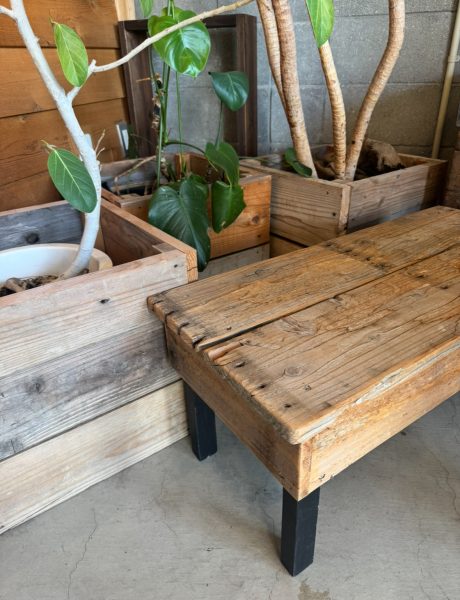 鉢カバーやベンチなど、手作りアイテムが多数。
